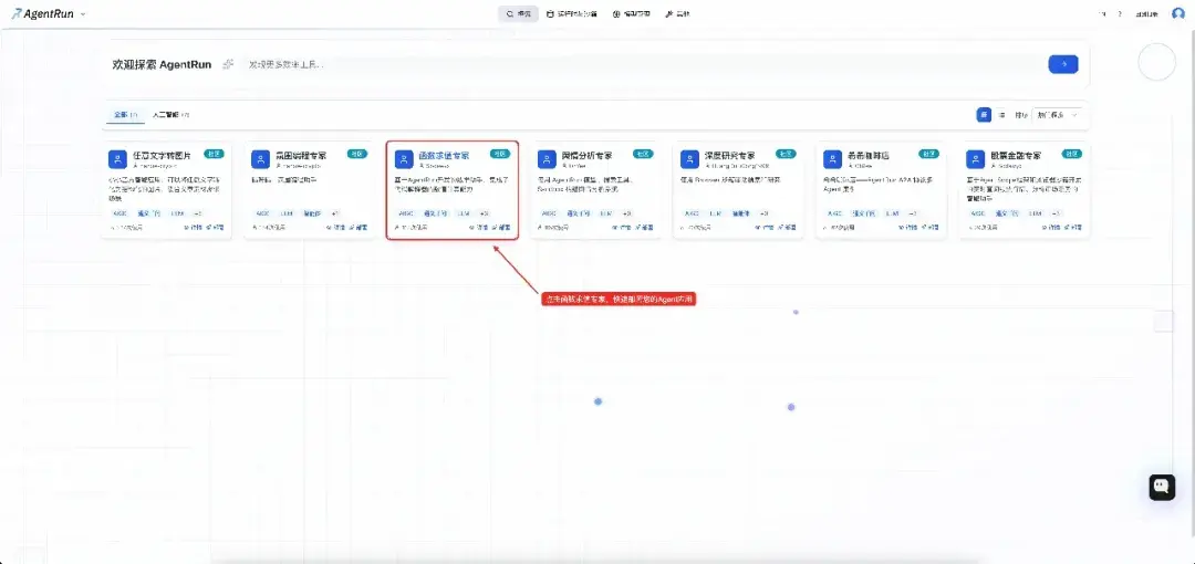 進入探索頁面,點擊函數求值專家,快速部署您的 Agent 應用