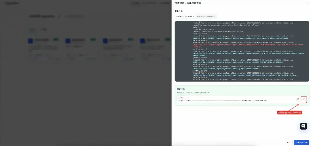 等待前端後端服務部署完成,點擊生成的域名,跳轉至智能體應用頁面快速體驗相關能力。