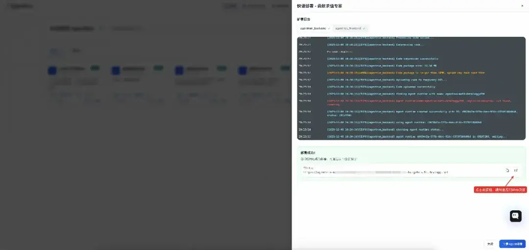 等待部署成功,點擊此按鈕,跳轉至應用體驗頁面