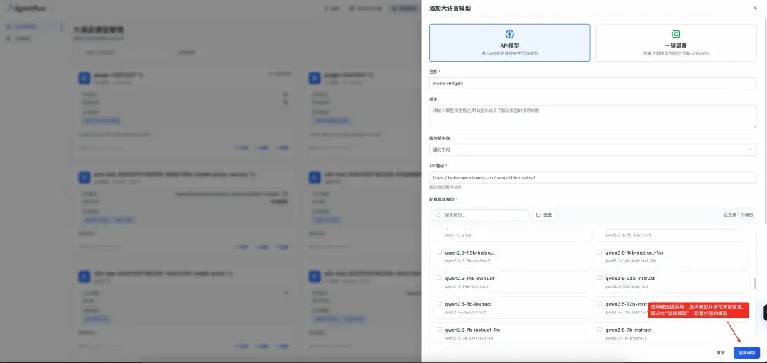 選擇模型供應商、選擇模型、配置憑證並點擊創建模型,創建好您的模型