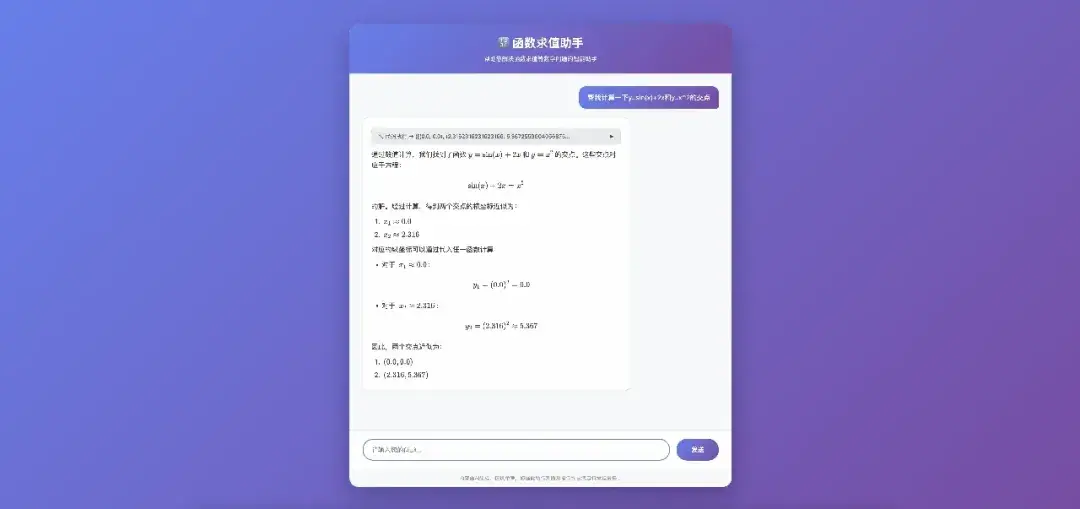 平台已為你準備好開箱即用的模板應用------"函數求值計算專家"。該智能體能理解用户輸入的數學求值問題(如計算sin(x) + x^2的極值),自動生成數值計算代碼並在沙箱中執行,最終返回數值計算分析結果。