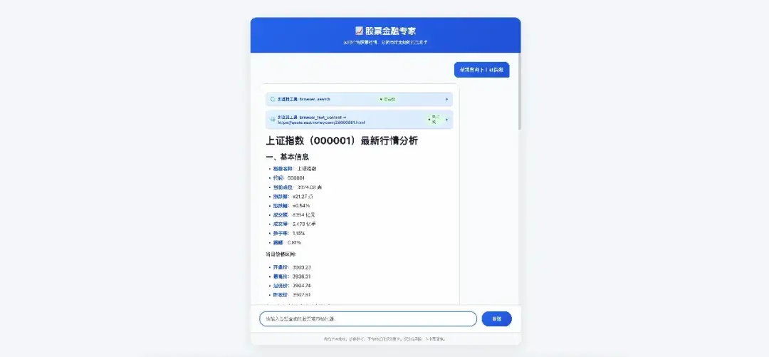 我們基於此能力打造了"金融股票專家"應用:用户輸入股票名稱或代碼,Agent 自動打開財經網站,抓取最新行情、財報摘要與新聞輿情,綜合分析後生成投資建議。