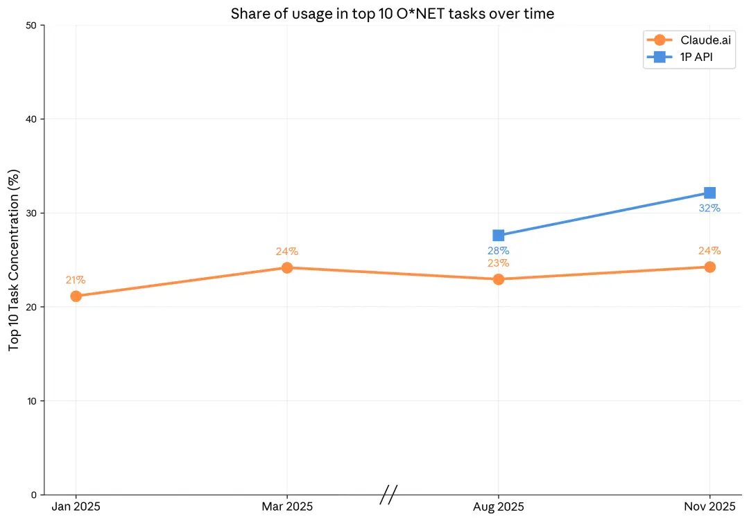 Claude 的任務使用依然集中:前 10 個任務佔 Claude.ai 會話的 24%,企業 API 端前 10 個任務佔 32%。