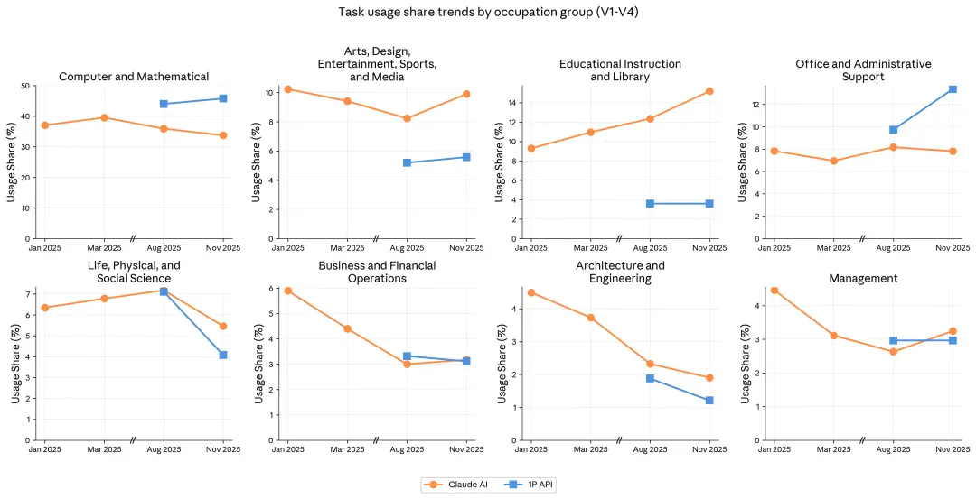 這份報告使用 2025 年 11 月的數據(Claude.ai 用户對話 & 企業 API 調用),引入了一套新的指標“經濟原語(economic primitives)”,以更深入地理解 AI 使用方式及其對經濟的影響。