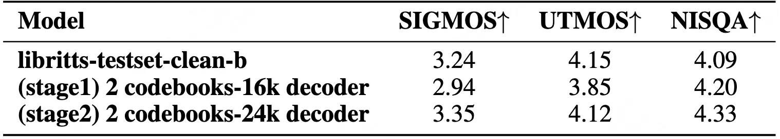 - <0.65kbps 區間(2 個碼本,0.43kbps):WER 2.10,STOI 0.839,在極端低比特率下仍保持高可懂性,適合資源受限場景。