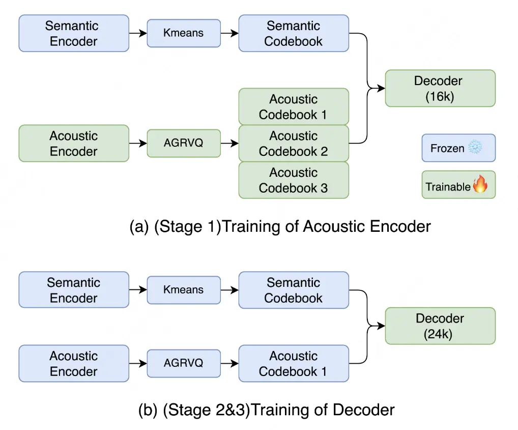 - 聲學 Token:隨後基於已有語義信息,結合改進的量化技術,在大碼本空間下補充韻律、音色等副語言特徵的聲學 Token,解決非語義信息覆蓋不足的問題。