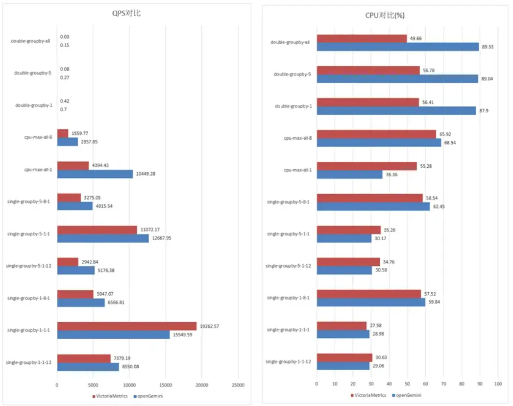 可以從結果看出來,openGemini在資源差不多的情況下,總共11個場景的10個場景查詢性能優於VictoriaMetrics(簡稱 VM),查詢模型single-groupby和查詢模型cpu-max-all:openGemini查詢性能約為 VM查詢性能的1.2-2.4倍;查詢模型double-groupby-5、double-groupby-all:openGemini查詢性能約為VM查詢性能的1-3倍。在single-groupby-1-1-1 場景下,VM依然表現出色。其設計理念是“極致簡潔”,不做過多的計算下推,因此在最簡單的查詢場景中具有天然優勢。
