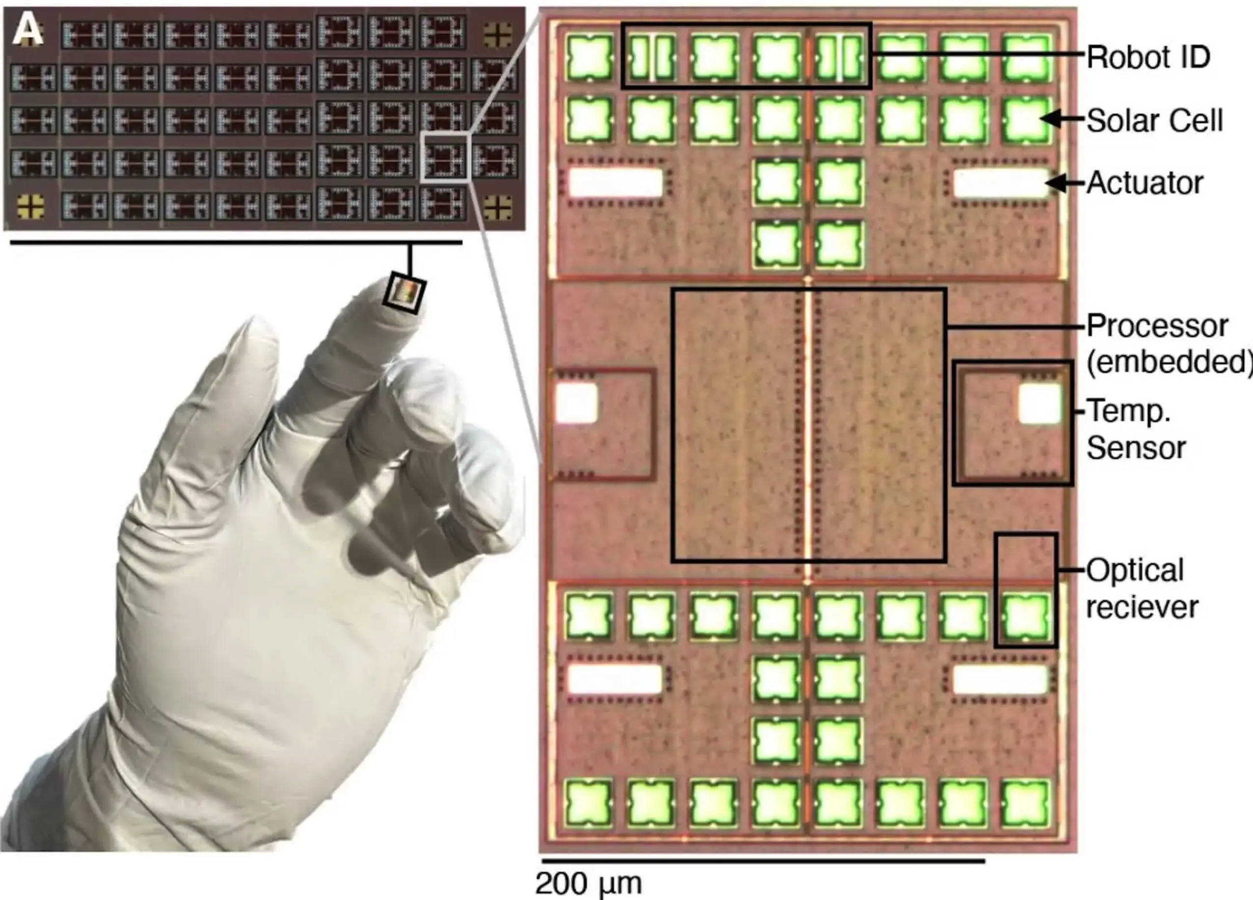 為實現自主性,研究人員整合密歇根大學戴維·布勞團隊的超小型計算機技術,該計算機曾在DARPA會議上被視為互補。太陽能板僅產75納瓦電能——比智能手錶少逾十萬倍——電路卻能在極低電壓下運行,處理器、內存、傳感器與電機全集成於數百微米結構中,能精確至三分之一攝氏度的温度感知,並追蹤熱梯度報告實時數據。