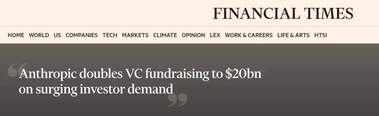 英國《金融時報》援引知情人士消息稱,由於投資者興趣高漲,開發出廣 Claude 和 Claude Code 的 Anthropic 公司已將其融資目標金額翻了一番,從 100 億美元提高到 200 億美元。