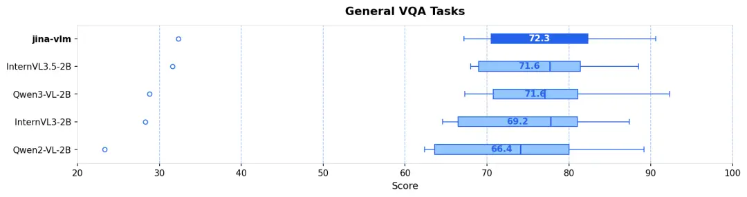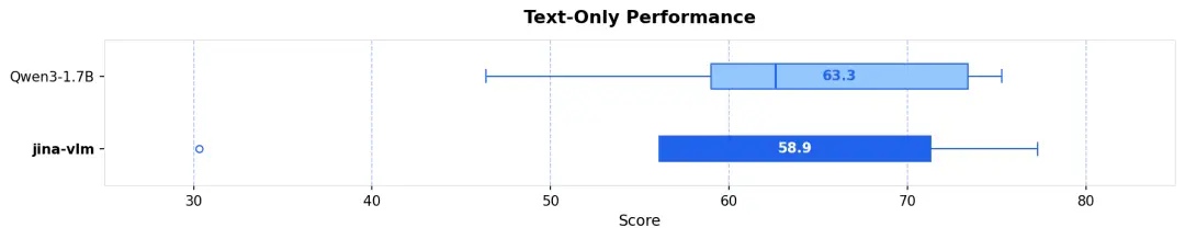 據介紹,在標準的 VQA 任務、多語言多模態理解(MMMB、MMBench),還是在 OCR 和純文本任務上,Jina-VLM 都是同規格模型裏最優級別的表現,且同時具備在消費級硬件友好的推理效率。