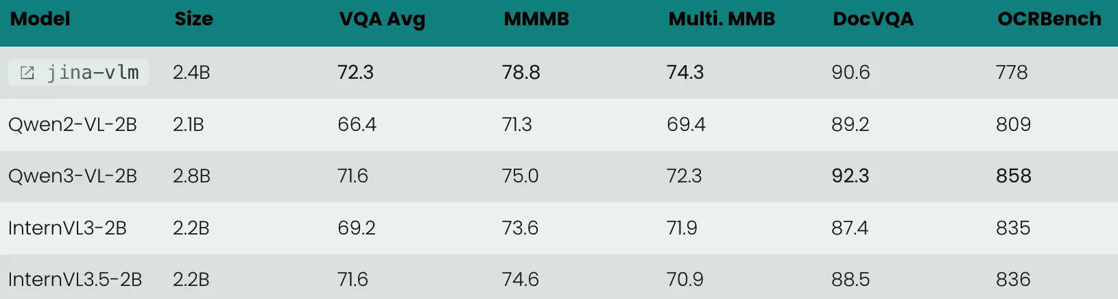 AI 搜索公司 Jina AI 發佈了Jina-VLM,這是一個 24 億參數的視覺語言模型,在開放的 2B 規模 VLM 中實現了最先進的多語言視覺問答。