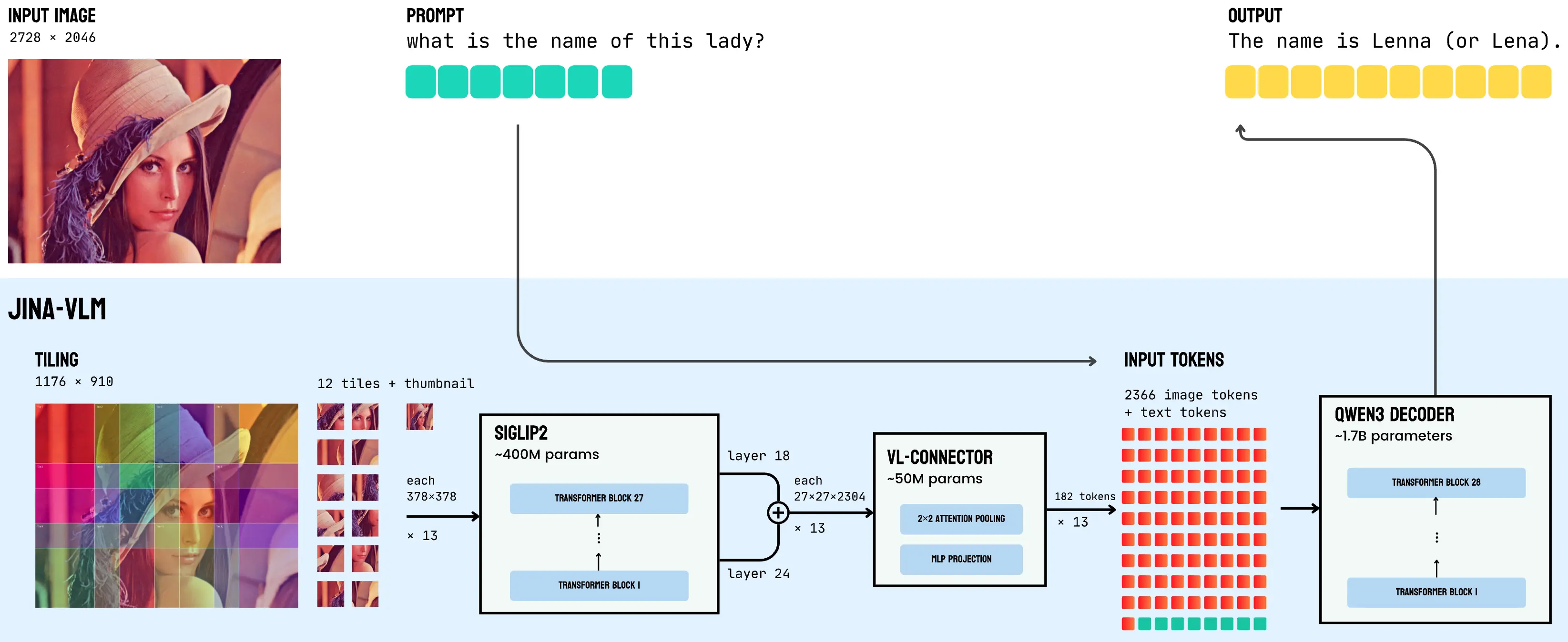 通過將 SigLIP2 視覺編碼器與 Qwen3 語言骨幹通過注意力池連接器相結合,Jina-VLM 在29 種語言中表現出色,同時保持了足夠的效率。Jina-VLM 架構圖如下,展示了從 SigLIP2 視覺編碼器 → VL-Connector → Qwen3 語言基座的數據流。
