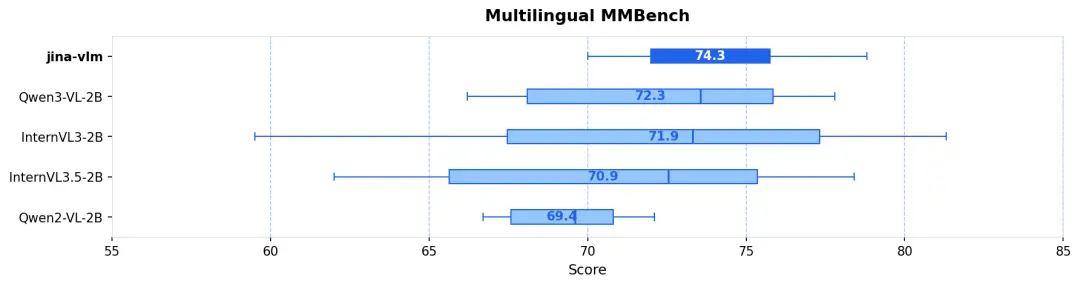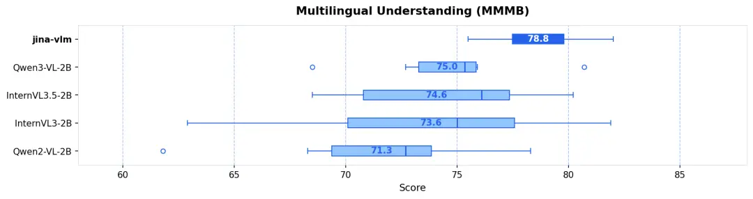 多語言理解 (MMMB SOTA) :在阿拉伯語、中文、英語、葡語、俄語和土耳其語等 6 大語種的測試中,Jina-VLM 以 78.8 分領跑,展現了卓越的跨語言視覺推理能力(見圖 1 & 圖 2)。