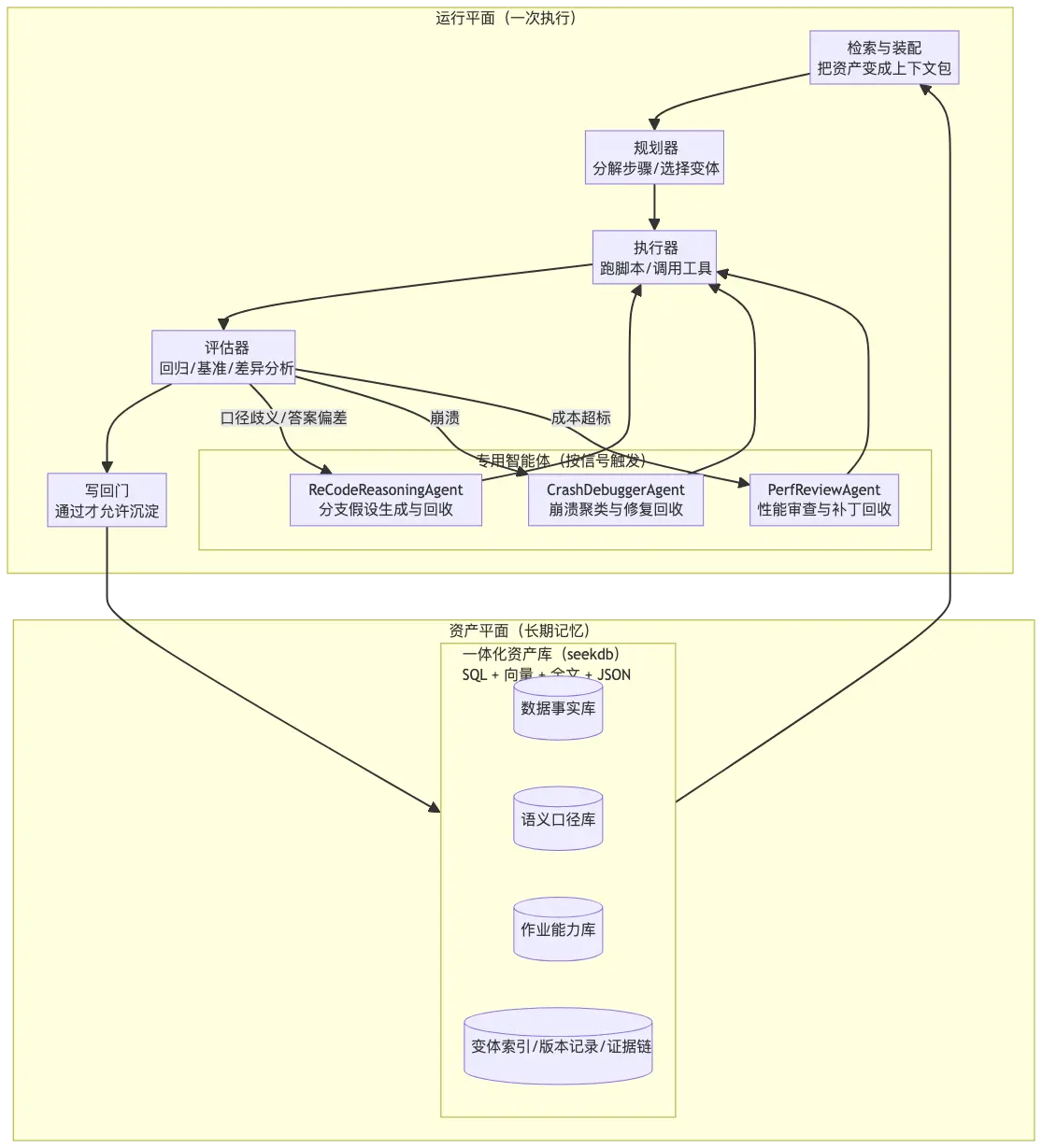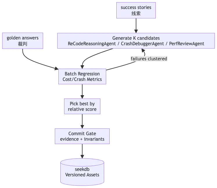 seekdb 的事務能力確保了這一點,把涉及的"註冊表更新 + 內容落庫 + 證據鏈記錄"作為一次原子操作提交。要麼全部成功並可追溯,要麼全部回滾不污染長期記憶。從工程角度看,這意味着寫回時不會出現"索引更新了但內容沒更新"的不一致狀態,回滾時能完整恢復到上一個穩定版本,證據鏈(如迴歸測試結果)與資產內容強綁定,可追溯、可審計。這是保證資產質量的關鍵機制。