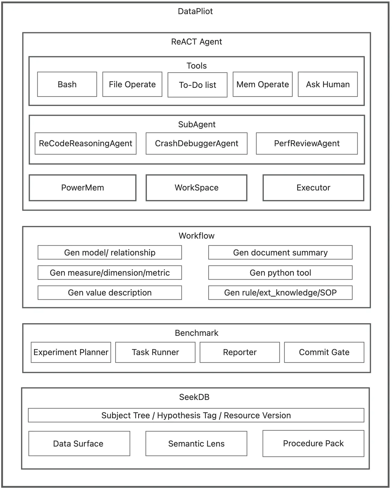 這張架構圖把 DataPilot 的“資產化閉環”落到可執行模塊上:上層 ReACT Agent 作為構建態與運行態的統一入口,用工具與沙箱執行驅動數據洞察,必要時調用子智能體生成多版本假設實現。