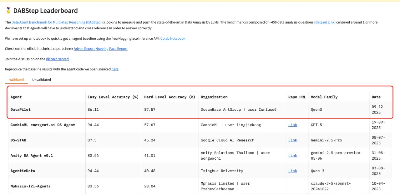 OceanBase DataPilot 在被譽為“數據智能時代新基準”的 HuggingFace DABstep 基準測試 Hard 級別中獲得全球最高分,並已連續 1 個月大幅領先第二名,位居全球第一。該⼯具旨在評估最前衞的語⾔模型和 AI 代理在多步驟推理中的能⼒,特別是在數據分析領域的表現。