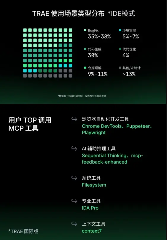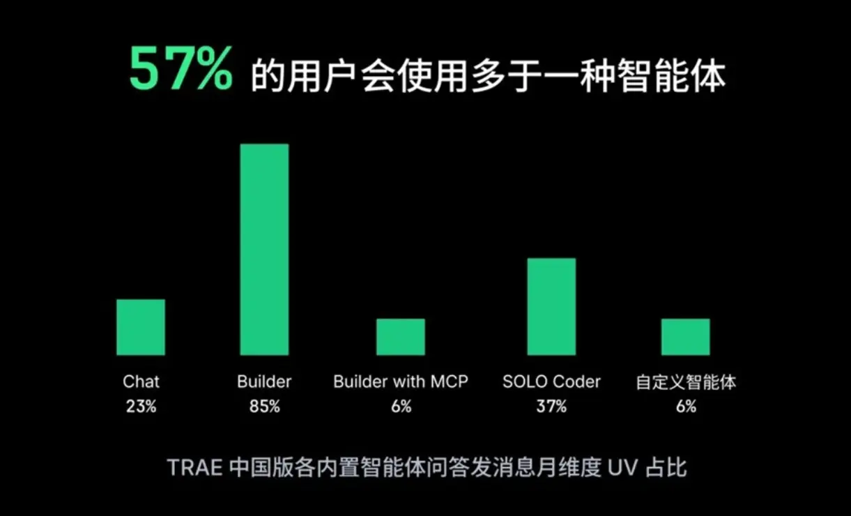 Trae支持豐富的AI協作模式,用户最青睞Builder模式(佔比80%),其次為SOLO Coder(佔比40%)。超過80%的用户採用多種智能體混用,表明開發者已熟練掌握不同模式的優勢與侷限。同時,平台支持超過1.1萬個MCP(模型連接協議),實現與外部工具的深度集成,進一步擴展AI在自動化場景的應用。
