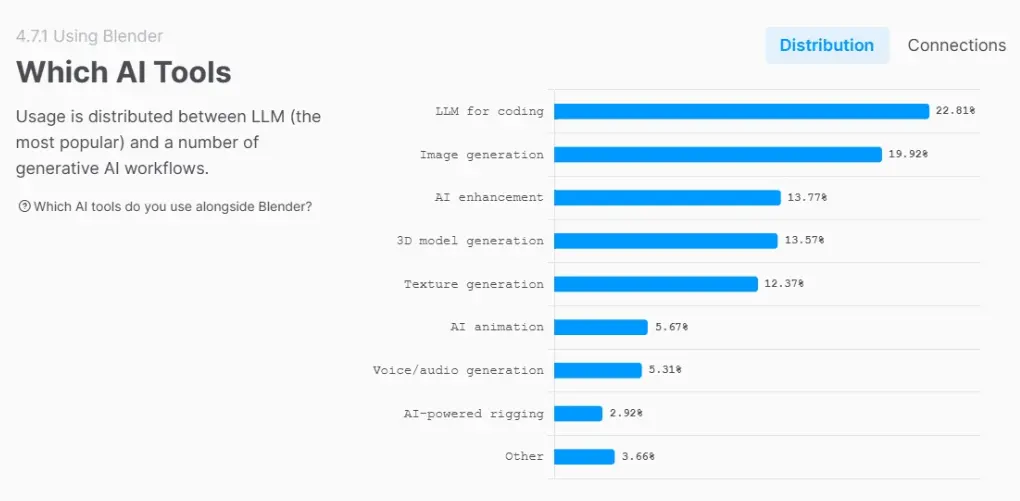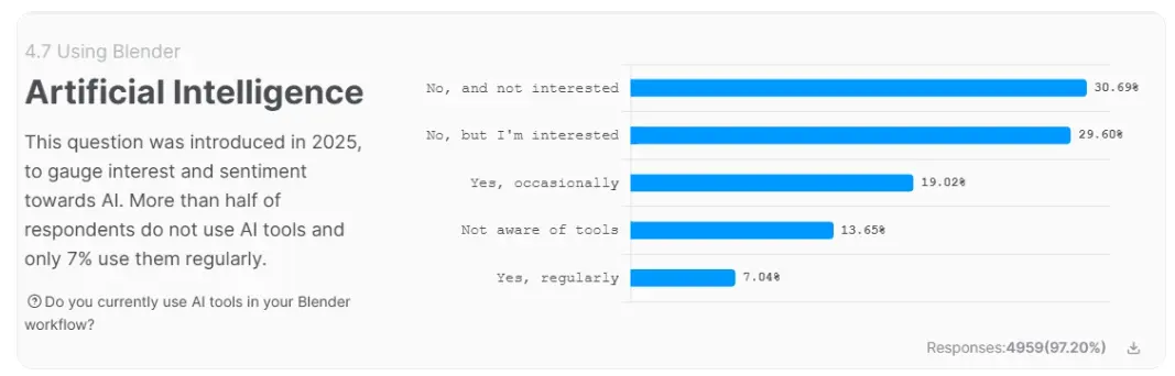 Blender 社區對 AI 的滲透率遠低於外界預期。數據顯示,超過半數的受訪者目前完全不使用 AI 工具,而經常在工作流中使用 AI 的比例僅佔7%。