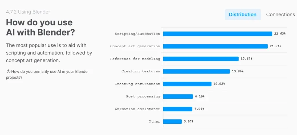 在那些已經嘗試集成 AI 的用户中,使用習慣也呈現出極強的“工具化”特徵。腳本編寫與自動化是 AI 應用最廣泛的場景(佔比約 22.6%),緊隨其後的是輔助生成概念草圖。