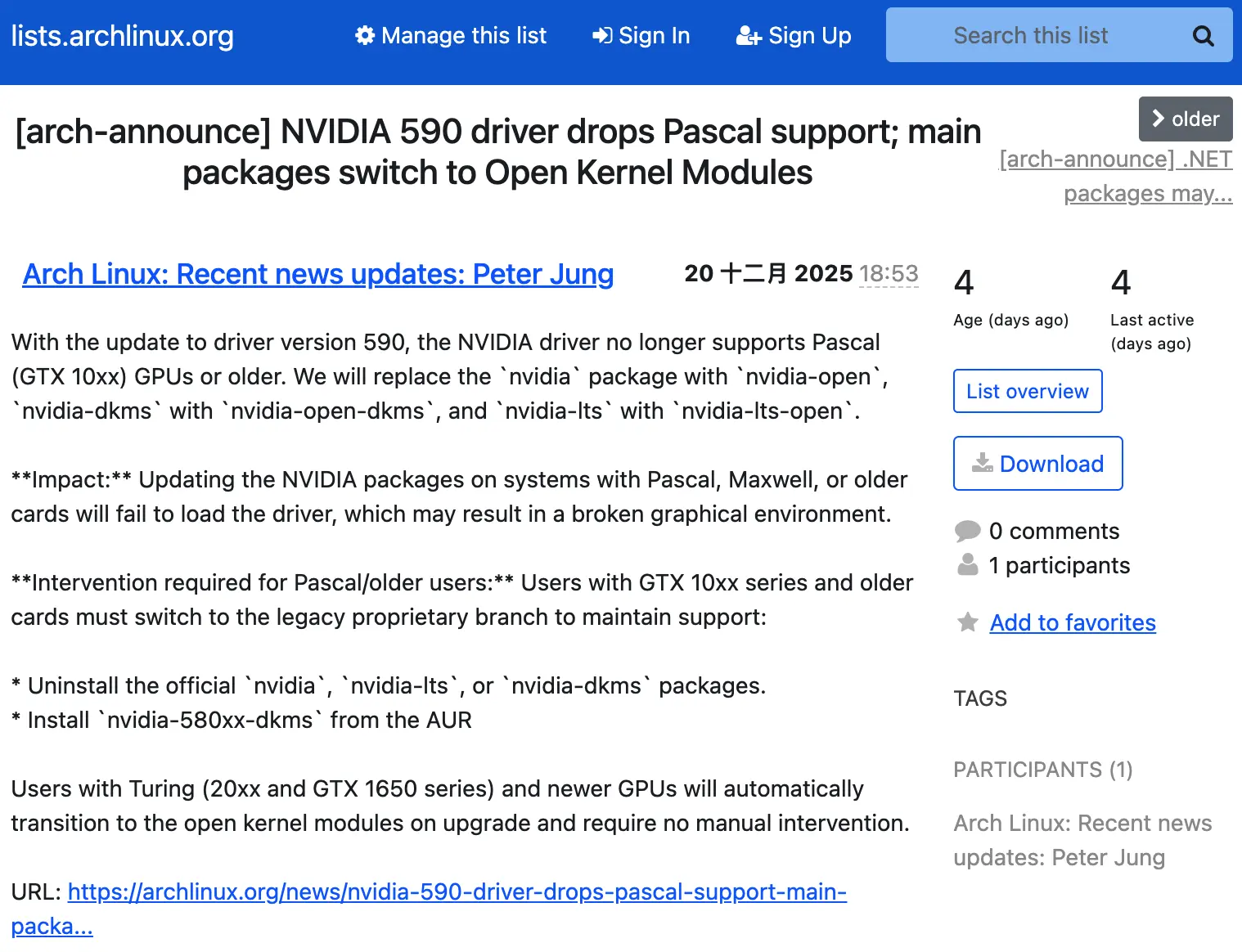 Arch Linux 近日調整其默認 NVIDIA 顯卡驅動配置,將官方倉庫中的默認閉源驅動版本升級為 590 分支,這一變動意味着來自 Pascal 架構及更早一代的 NVIDIA GPU 將不再由該默認驅動分支支持,其中包括 GeForce GTX 10 系列以及更老型號。
