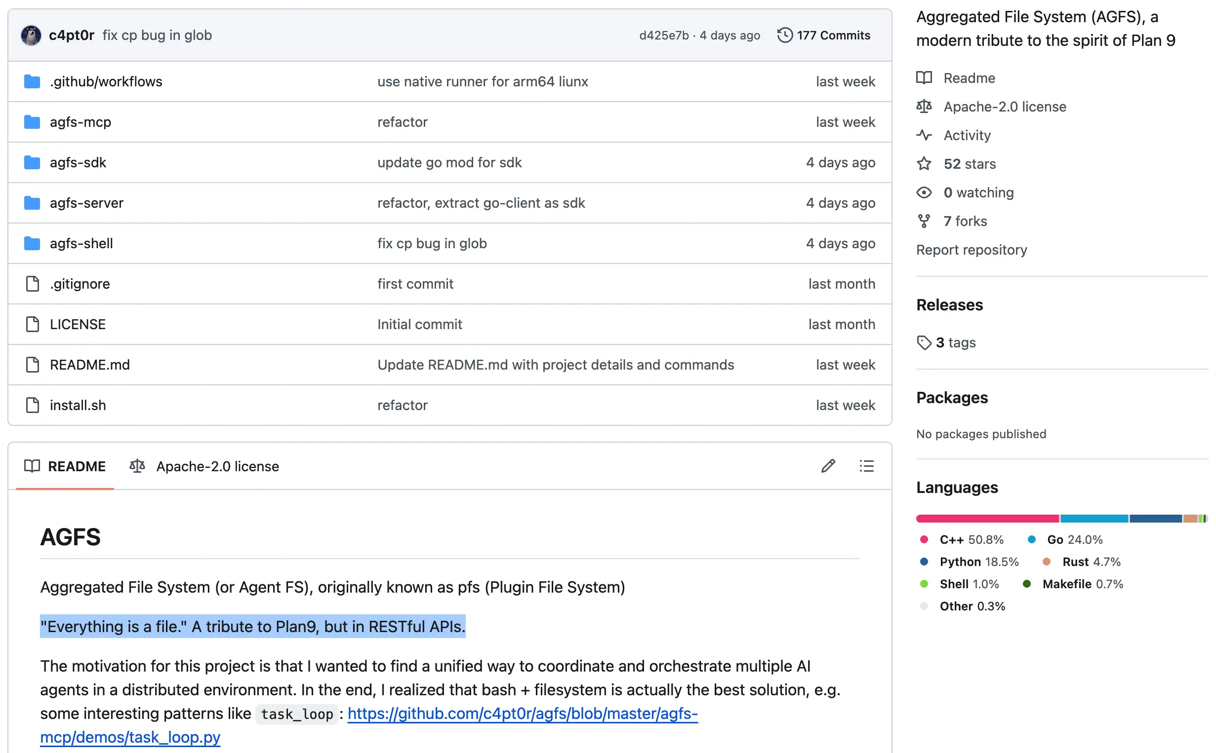 根據介紹,AGFS(Aggregated File System / Agent File System)嘗試以“文件系統統一抽象”方式聚合現代多種後端服務。項目靈感來自 Plan 9 的“萬物皆文件(Everything is a file)”理念,希望在當下 AI Agent 與分佈式應用快速增長的背景下,提供統一的訪問接口。