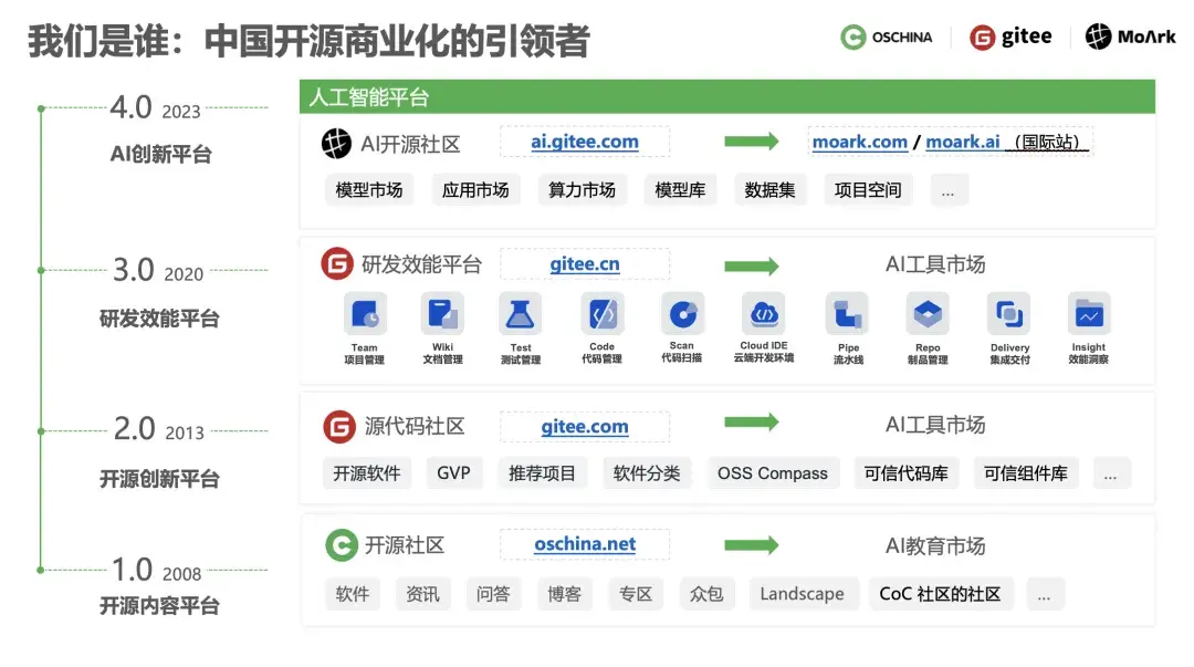 開源中國自 2008 年起步,迄今已構建涵蓋社區、研發協同、AI 平台在內的全棧體系,旗下平台包括開源中國社區、Gitee、模力方舟。業務覆蓋模型市場、工具市場、教育市場、算力調度、數據集開放等多個領域,是國內為數不多具備完整「模型—算力—應用」閉環能力的平台之一。