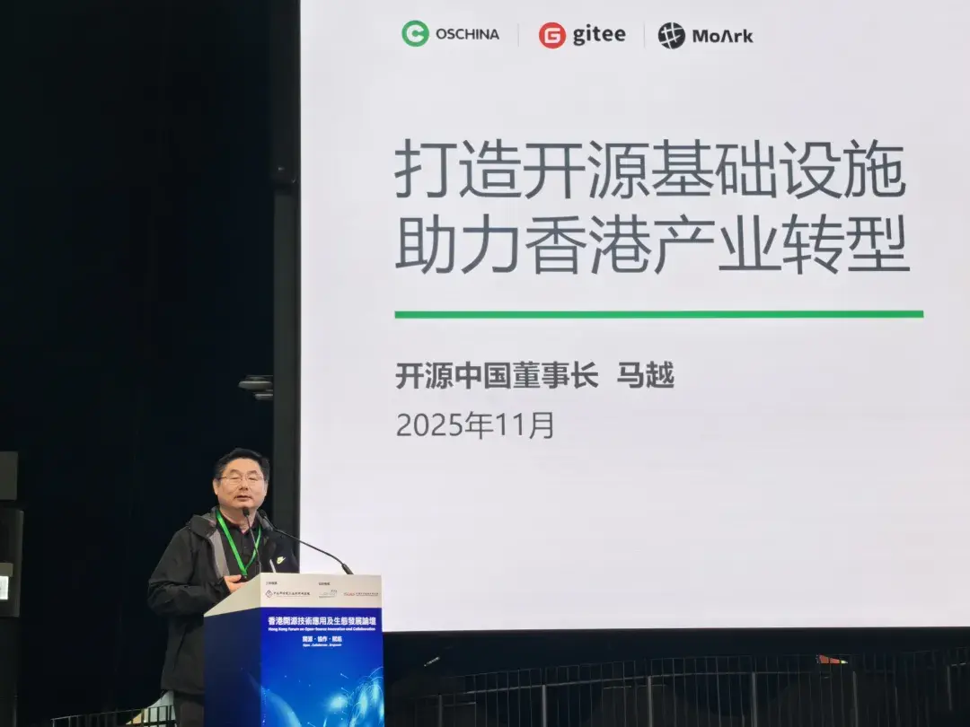 2025 年 11 月 25 日,由中國科學院香港創新研究院主辦的「香港開源技術應用及生態發展論壇」在香港數碼港舉行。開源中國董事長馬越受邀發表演講,圍繞平台佈局、國家級項目進展、AI 技術能力與國際化戰略,系統闡述了開源中國如何以基礎設施為核心支撐,服務從本地研發協同到全球生態鏈接的轉型目標。