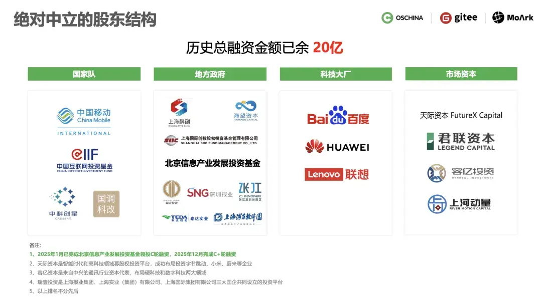 2025 年,開源中國先後完成 C 輪與 C+ 輪融資,總融資額突破 20 億元,股東結構涵蓋國家隊、地方政府、科技大廠與市場資本,保持中立治理。