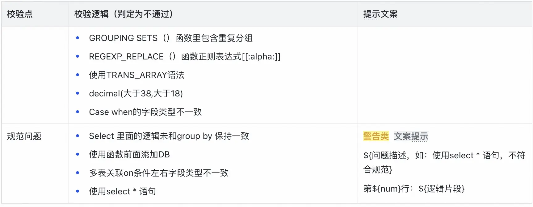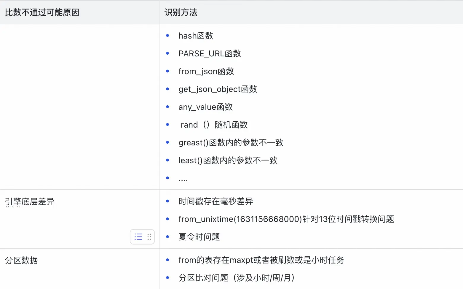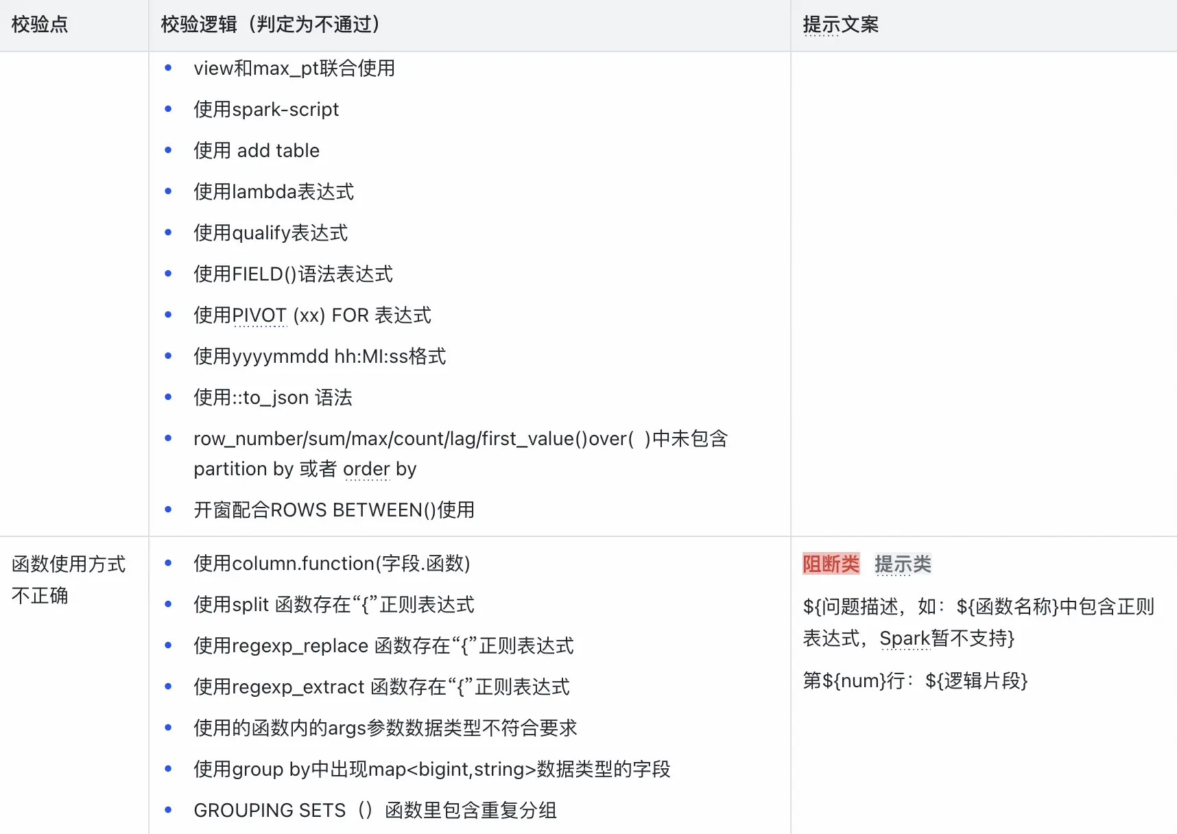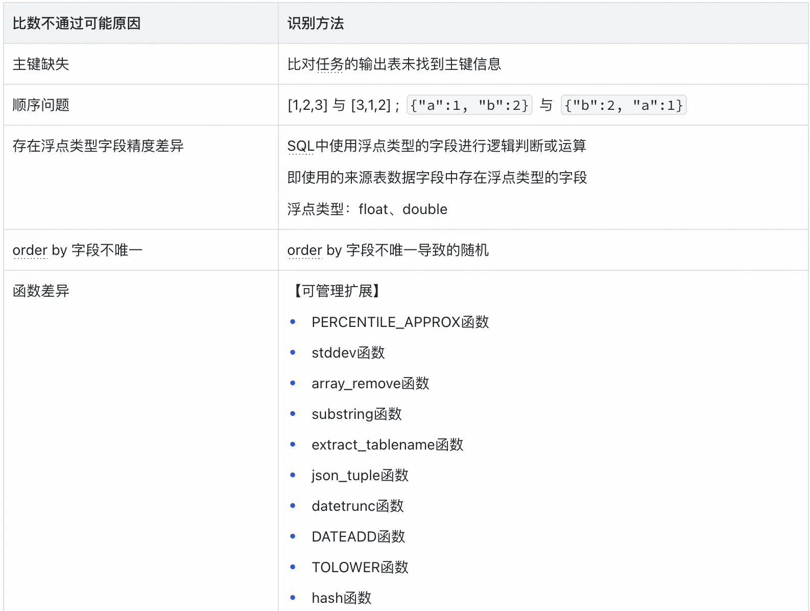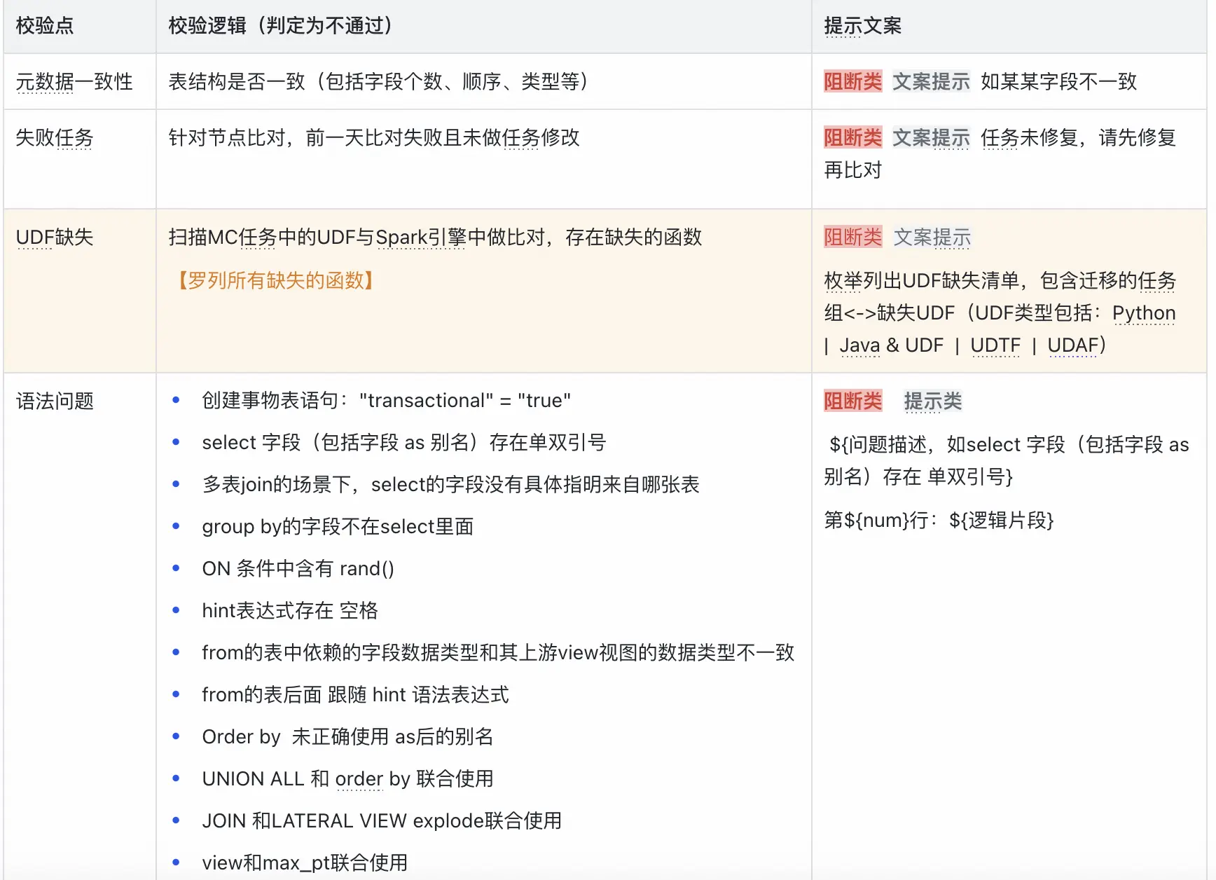 - 函數缺失校驗: 針對Spark引擎,校驗SQL中使用的函數是否存在、是否能被正確識別,避免因函數不支持而導致的比對失敗。