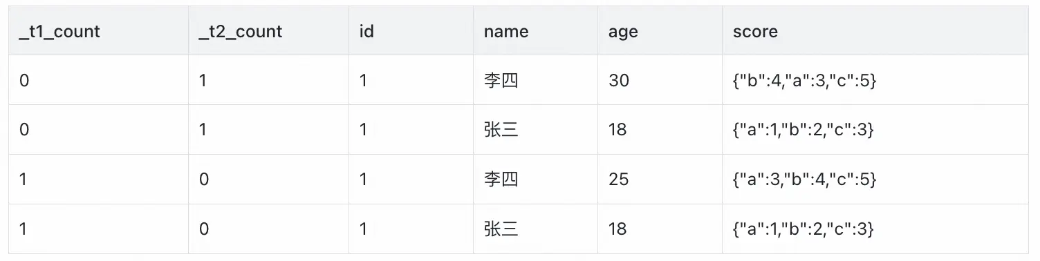 select 1 as _t1_count, 0 as _t2_count, `id`, `name`, `age`, `score`