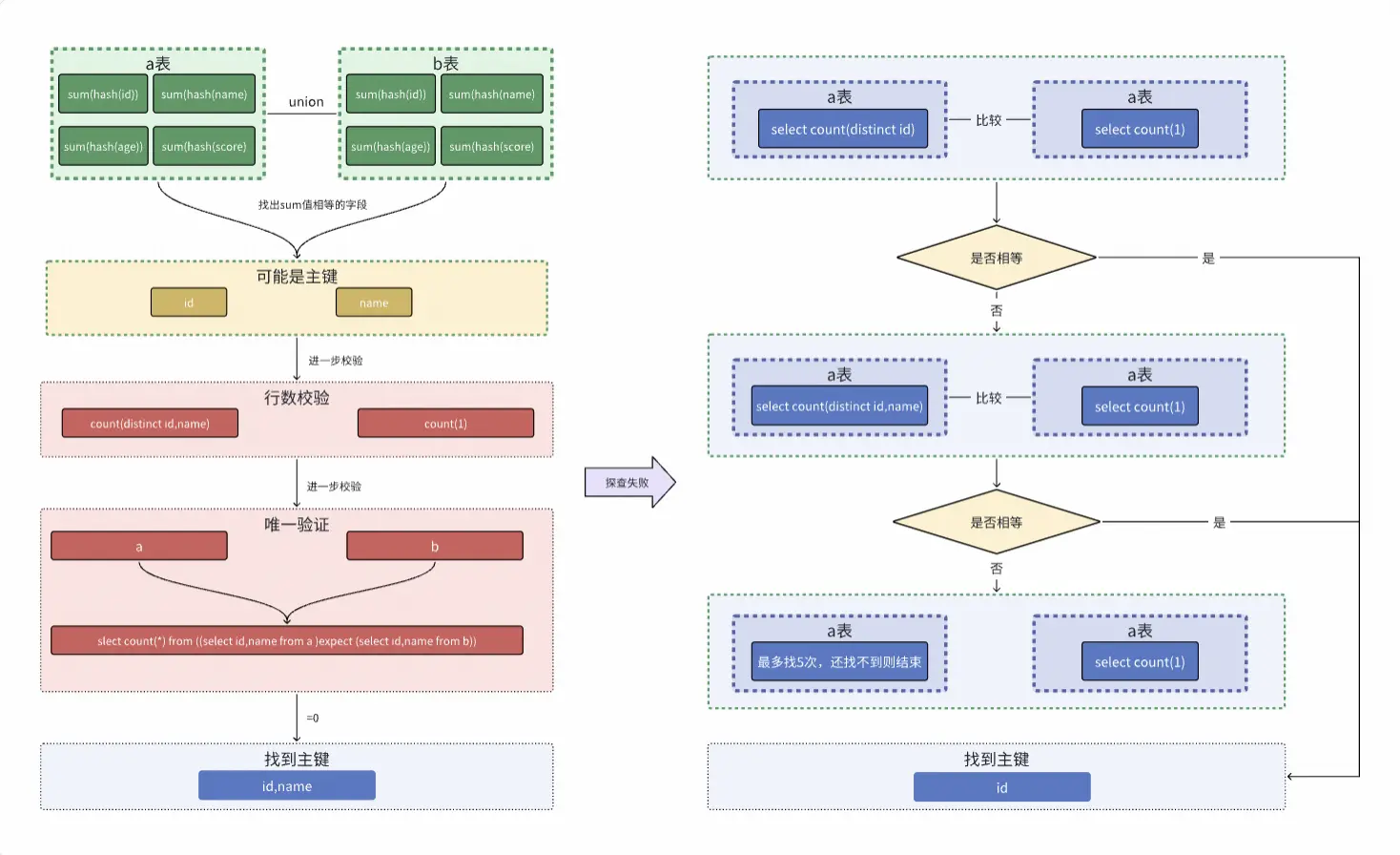 select count(distinct id,name) from a 與 select count(1) from a比較,如相等主鍵為id,name ,不相等繼續往下執行