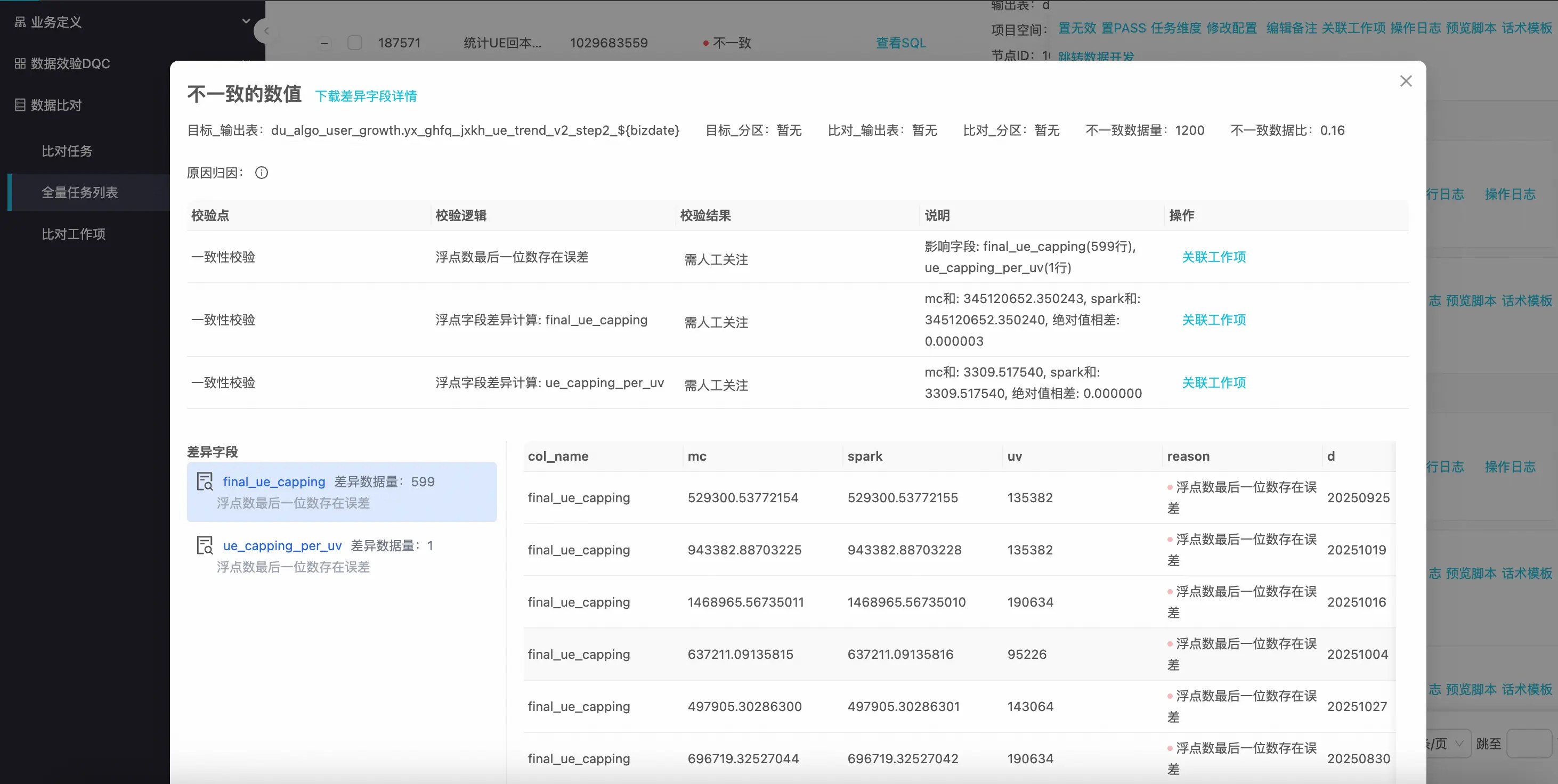在前期遷移過程中,遷移同學需要手動join兩張表來識別不一致數據,然後逐條、逐字段進行人工比對驗證。這種方式在任務量較少時尚可應付,但當任務規模達到成千上萬級別時,就無法實現併發快速分析。