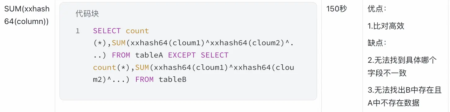 SELECT count (*),SUM(xxhash64(cloum1)^xxhash64(cloum2)^...) FROM tableA