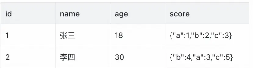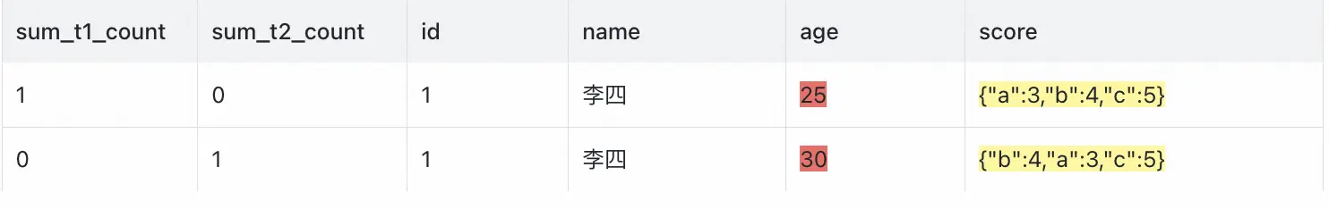 通過以上結果表可以得出兩表的age字段不一致 ,score不一致(但按key排序後一致)。