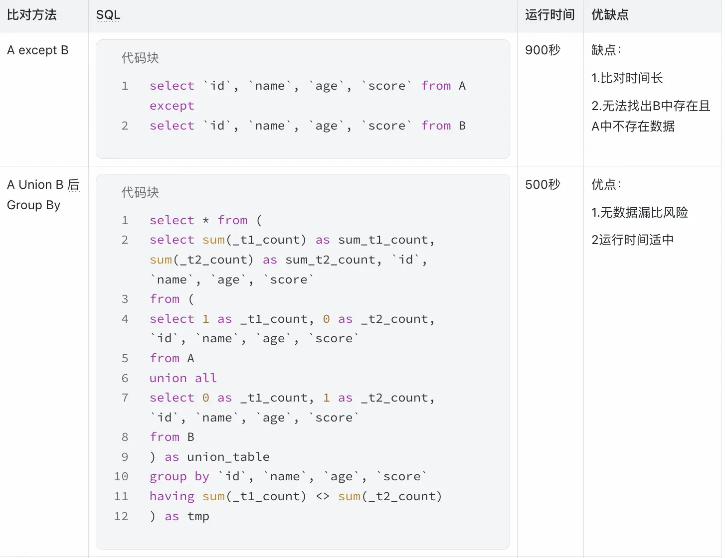如果有記錄為空説明數據一致,不為空説明數據不一致需要採用上面提到union 分組的方法去找出具體字段哪裏不一樣。
