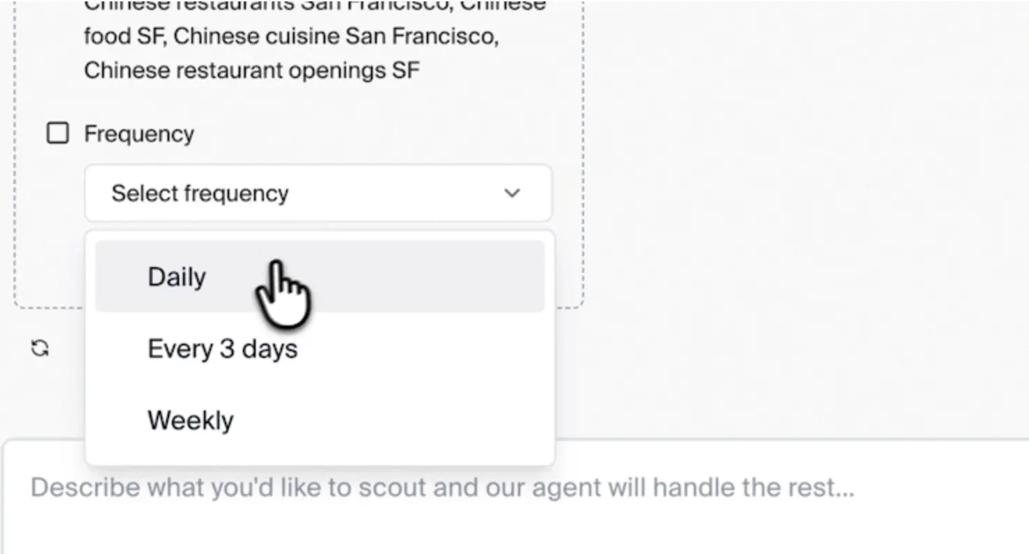 據介紹,用户可以通過定義監控目標來創建 scout,例如監控附近新開餐廳或追蹤 AI 新聞,系統會自動配置搜索策略。