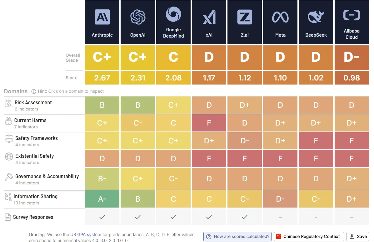 非營利機構生命未來研究所(Future of Life Institute)最新發布了一份《AI 安全指數》報告,由 AI 領域專家對領先的 AI 公司在關鍵安全領域進行評級。