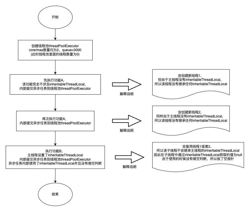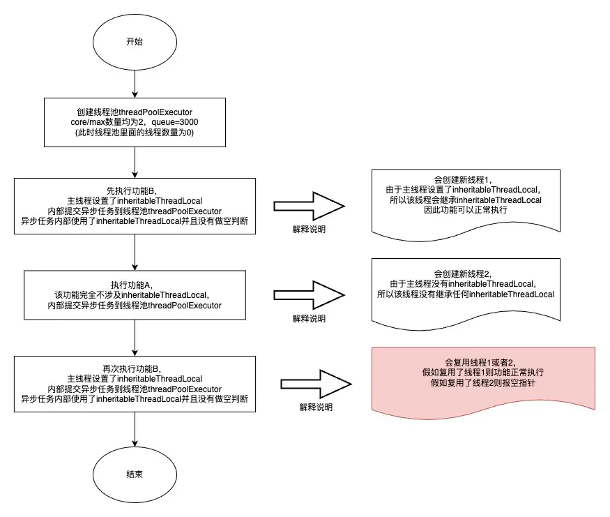 在執行這個報錯的異步任務的時候,複用了某個已有的線程A,並且當時創建該線程A的時候,沒有繼承InheritableThreadLocal,進而導致後面複用該線程的時候,從InheritableThreadLocal獲取到的值為null。