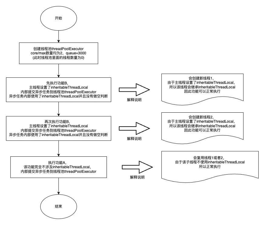 而只要是通過這段歷史代碼創建的線程一定是沒問題的,所以一定是存在其他業務共用了這個線程池,並且這個業務優先執行進而初始化了線程池的線程,導致線程池的線程沒有繼承InheritableThreadLocal。