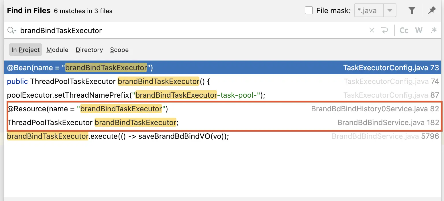 在項目裏面搜一下看看,果真如此,有2出地方在用這個線程池,並且另外的一處代碼中提交的異步任務不涉及inheritableThreadLocal: