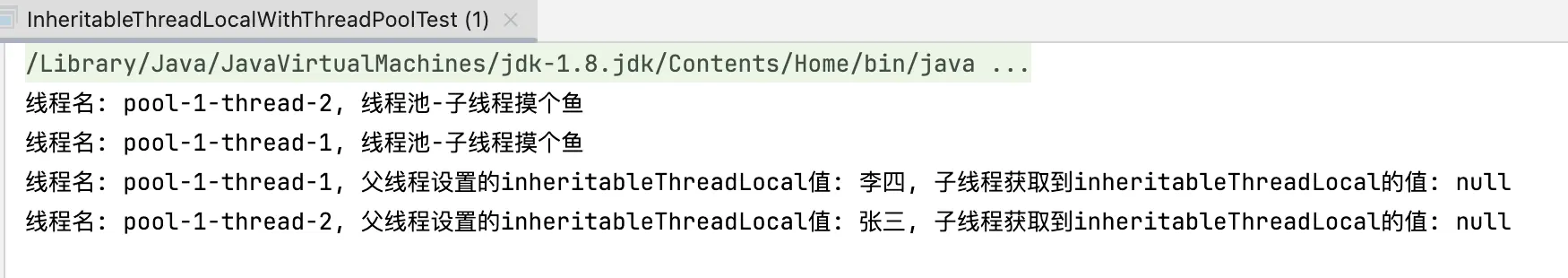 執行結果如圖所示,可以看到在線程池裏面也可以獲取到父線程設置的inheritableThreadLocal值。