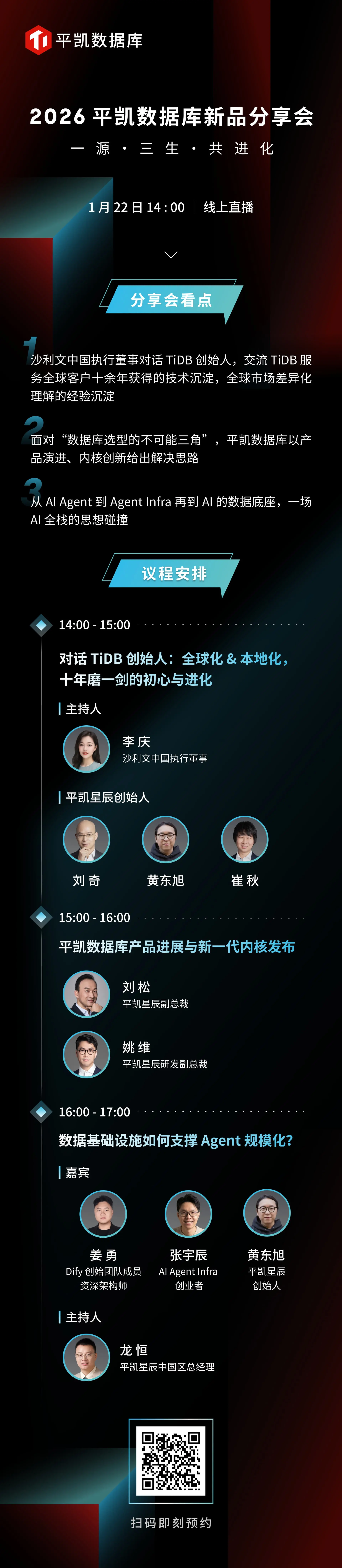 2026 平凱數據庫新品分享會,議程來了~ 亮點一覽 TiDB 創始人齊聚,沙利文中國執行董事帶你探索 TiDB 全球化與本地化的十年往事 如何面對數據庫不可能三角?平凱數據庫以產品演進、內核創新給出解決思路 從頂層設計到底層邏輯,一場 AI 全棧的破壁對話…… 歡迎掃碼預約直播,1 月 22 日 14:00,不見不散!