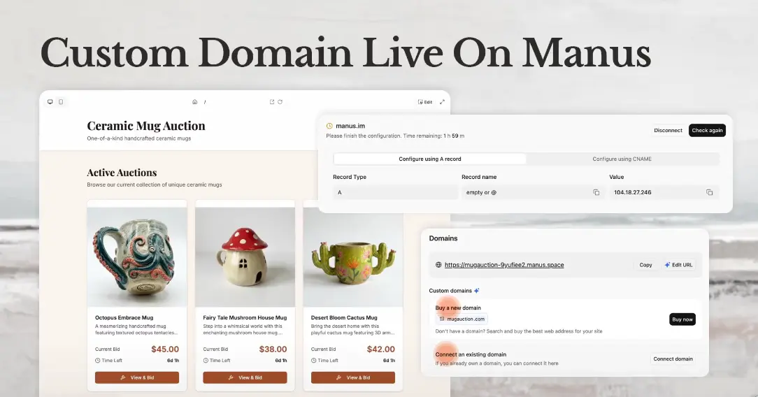 通用智能體平台 Manus 宣佈了一項重要更新,其自定義域名功能現已正式上線。 點擊“購買”,Manus 會幫你完成所有設置,你的網站幾分鐘內就能上線。如果你已經擁有域名,只需關聯一下就完成了。 根據介紹,該功能允許用户在平台內直接購買新的域名,或者將自己已經擁有的域名連接到 Manus 服務,從而提升品牌形象和用户訪問的便捷性。