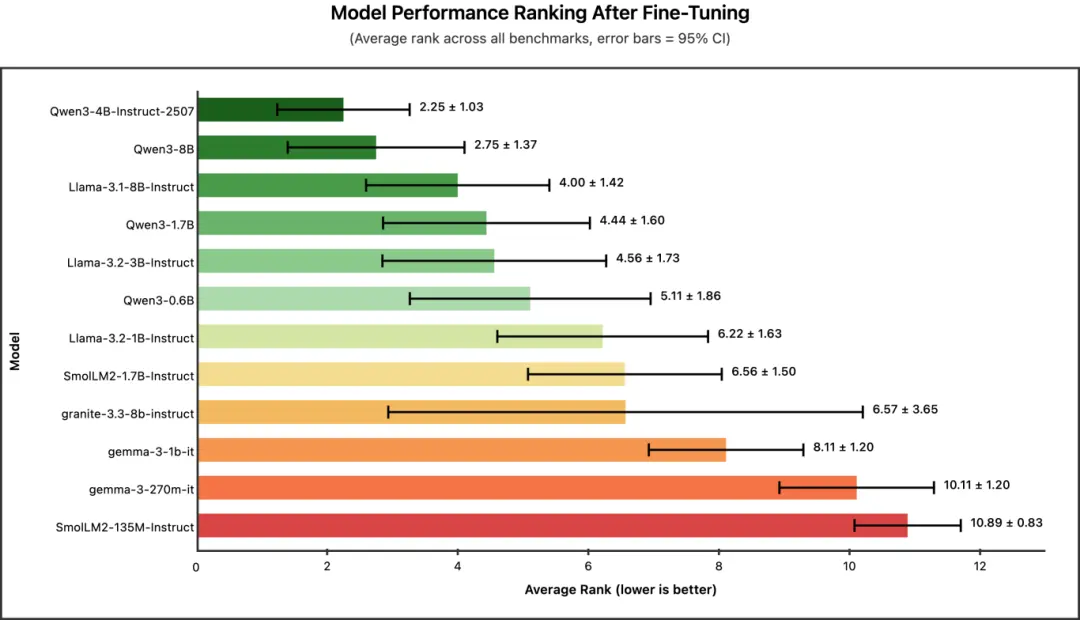 微調後性能最佳的模型:Qwen3 系列模型在微調後始終表現最強,其中 4B 版本整體表現最優。如果你的目標是在特定任務上獲得最高準確率,Qwen3-4B 就是你的首選。