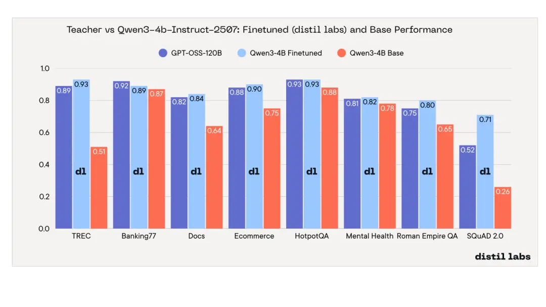 經過微調的小型語言模型(SLM)可以勝過規模大得多的模型:微調後的 Qwen3-4B 在 8 項基準測試中的 7 項上表現能夠超越或戰平 GPT-OSS-120B(一個比它模型規模大 30 倍的教師模型),剩下的一項差距也不到 3 個百分點。在 SQuAD 2.0 數據集上,微調後的學生模型甚至比教師模型高出 19 分。這意味着你只需極低的成本,就能在自己的硬件上實現前沿模型級別的準確率。
