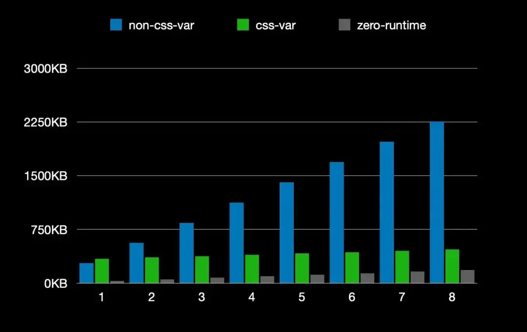 性能對比如下,zeroRuntime 模式表現最佳(水平軸為主題數量):