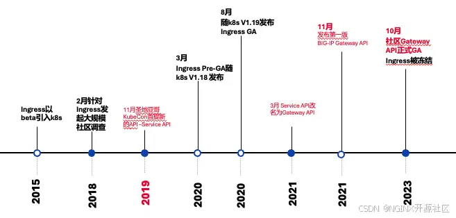 Ingress 規範本身從 2015 到 2020 年 8 月,隨着 Kubernetes v1.19 的發佈才被正式 GA,跨越了約 5 年時間。而實際上,就在 Ingress 規範 GA 之前,2018 年 2 月社區針對 Ingress 發起過大規模的社區調查,隨後在 2019 年 11 月聖地亞哥的 KubeCon 上,一個新的 API:Service API 被提出,這個 Service API 就是 Gateway API 的前身,2023 年 10 月 Ingress API 最終被社區正式凍結,推薦用户轉向 Gateway API 規範。