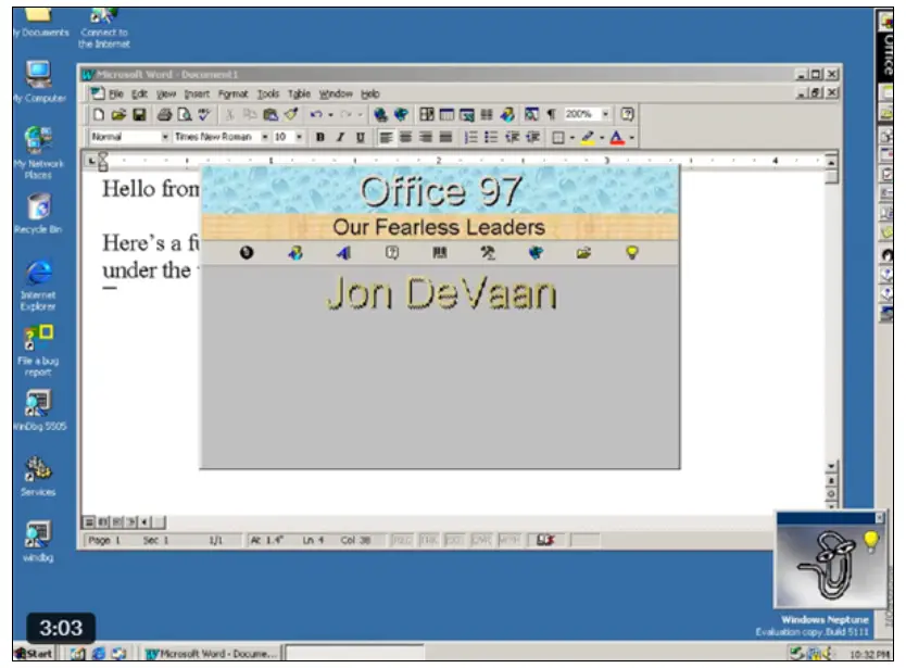 近日,有開發者重新挖掘出 Office 97 中一枚“遠古”彩蛋:通過一套極其複雜的操作步驟,可以觸發類似製作人員名單的隱藏畫面,屏幕上還會出現回形針助手 Clippy 一邊吐槽一邊“打趣”。這一發現勾起不少老用户的懷舊情緒,同時也引出一個現實問題:為何如今的微軟幾乎已經不再在 Windows 等主力產品中埋藏類似的彩蛋?