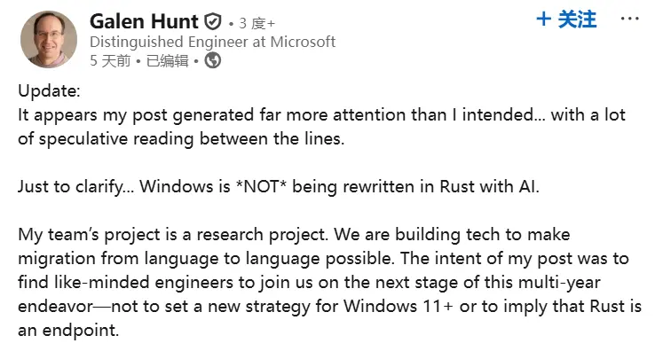 此言一出引發了廣泛的關注與討論。鑑於此,Galen Hunt 不得不再次出面進行澄清表示,微軟目前並沒有用 Rust 語言配合 AI 進行重寫 Windows 系統的計劃: