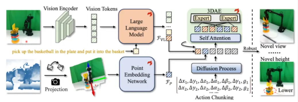 GeoVLA 的核心邏輯在於將任務進行解耦:讓 VLM 負責 “看懂是什麼”,讓點雲網絡負責 “看清在哪裏”。這個全新的端到端框架包含了三個關鍵組件的協同工作,分別是語義理解流、幾何感知流和動作生成流。這種方法使得模型能夠更精準地進行任務。